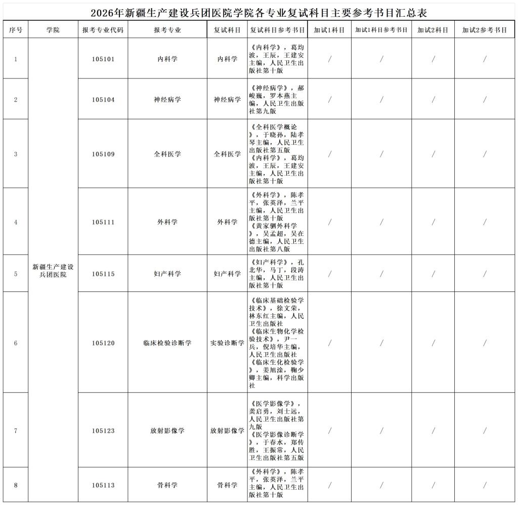 2026年新疆生产建设兵团医院学院各专业复试科目主要参考书目汇总表.xls