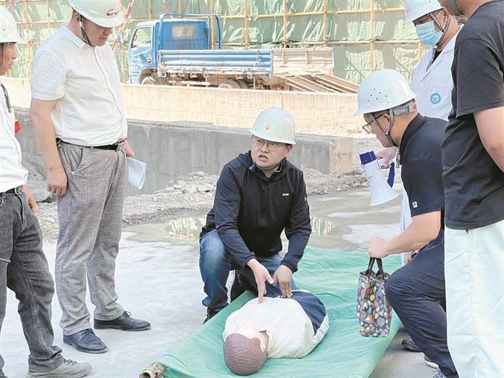 李永生(中)给工地务工人员现场讲解急救知识(资料图片)。兵团医院提供